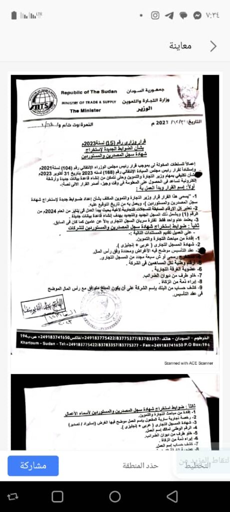 بحيث يبدأ العمل بهذا العمل في يناير 2024 م الرقم (1) ويشمل ذلك السجلات الجديدة والتجديد بهدف انشاء قاعدة بيانات جديدة .واعتمد القرار الجديد لوزير التجارة عام واحد بدلا عن عامين لسريان السجل التجاري .ووضع القرار جملة من الضوابط لاستخراج شهادة سجل المصدرين والمستوردين للشركات وضوابط اخري استخراج شهادة سجل المصدرين والمستوردين لاسماء الاعمال وضوابط استخراج شهادة سجل المصدرين والمستوردين للاستثمار وضوابط لاستخراج شهادة سجل المصدرين والمستوردين لاسماء الاعمال المملوكة للشركات وضوابط استخراج سجل شركات المساهمة العامة من بنوك والجيش والقطاع العام.